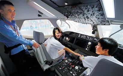 鄉(xiāng)村教師孫云霞、孫鳳霞在國(guó)產(chǎn)大飛機(jī)樣機(jī)機(jī)艙內(nèi)體驗(yàn)駕駛操作。 徐瑞哲 攝