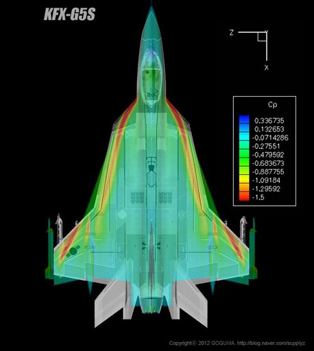 KFX有正常式布局的101方案和鴨式布局的201方案。KFX-101外形上類似于F-22,尺寸略小,采用了DSI進氣口設計,近乎于一種F-35的雙發(fā)型;另一種則為KFX-201,采用了鴨式布局并列雙發(fā)外傾式雙垂尾設計。飛機的前翼、主翼以及垂直尾翼均為梯形,前緣后掠角稍大而后緣前掠角較小,均互相平行。前翼沒有上反角,而且與主翼在同一平面上而不是高于主翼。尾翼設計也很普通,直接安裝在機身上的兩個外傾式垂直尾翼完全起不到對噴口紅外特征的遮擋作用。而且過于靠前、靠內(nèi)的垂直尾翼在飛機大迎角飛行時完全被其機身和主翼的遮蔽。比較特別的是,為了保證對地面雷達的低可探測性,KFX-201的機頭為帶棱角的五邊棱錐。