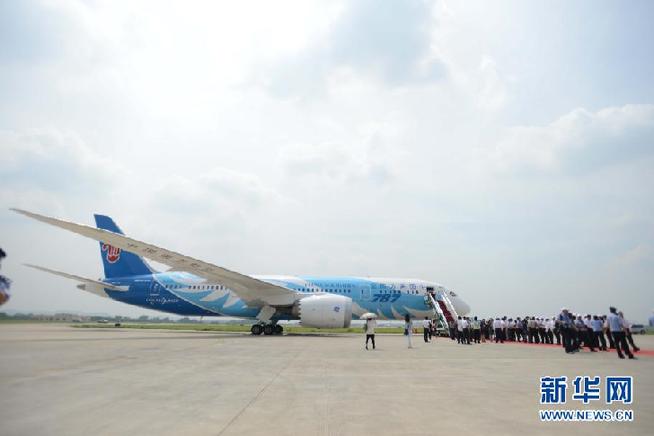 6月2日,南方航空公司在廣州白云機場舉辦接機儀式,宣布中國引進的首架波音787夢想飛機正式啟動運營。當(dāng)日,我國引進的首架波音787夢想飛機飛抵廣州。 新華社記者 王建華 攝