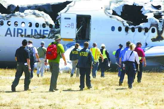 美國國家運(yùn)輸安全委員會調(diào)查人員在事故現(xiàn)場檢查飛機(jī)殘骸。