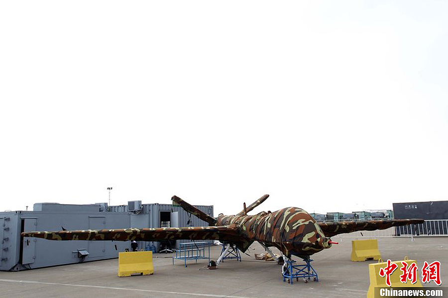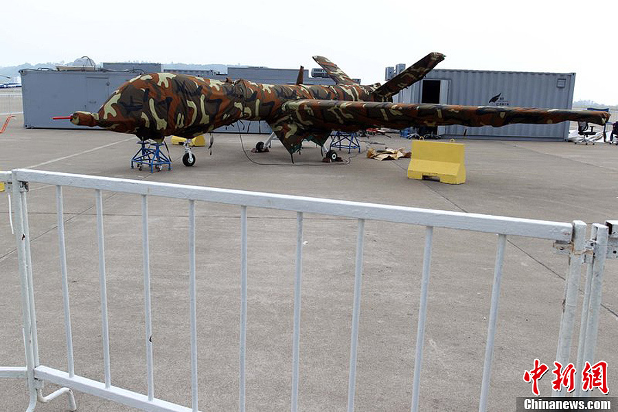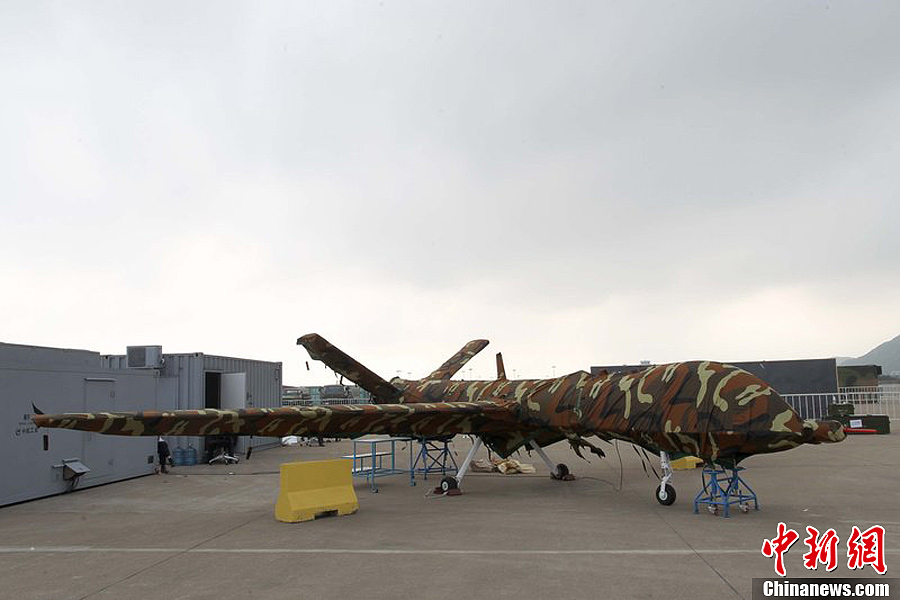 曾在前兩屆珠海航展上展出模型的翼龍無人機,在今年航展上以實物參展。11月8日,該機已經(jīng)組裝完畢停放在展坪上。該款無人機由中航工業(yè)旗下成都飛機設(shè)計研究所研制,該機裝有一臺100馬力活塞發(fā)動機,具備全自主平輪式起降和飛行能力,最大起飛重量達1100公斤,最大續(xù)航時間為20個小時,可攜帶各種偵察、激光照射/測距、電子對抗設(shè)備及小型空地打擊武器,可執(zhí)行監(jiān)視、偵查及對地攻擊任務等任務,也可用于維穩(wěn)、反恐、邊界巡邏等。