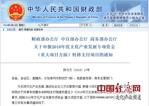 通知說明,為支持文化產(chǎn)業(yè)發(fā)展,推動社會主義文化繁榮興盛,根據(jù)《深化財稅體制改革總體方案》《國務院關(guān)于改革和完善中央轉(zhuǎn)移支付制度的意見》《2018年文化體制改革和發(fā)展工作要點》等有關(guān)要求,財政部、中宣部和商務部聯(lián)合管理2018年文化產(chǎn)業(yè)發(fā)展專項資金(重大項目方面,以下簡稱專項資金)轉(zhuǎn)移支付項目申報工作。