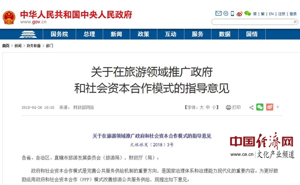 經(jīng)濟日報-中國經(jīng)濟網(wǎng)北京5月7日訊 近日,文化和旅游部、財政部日前聯(lián)合印發(fā)了《關于在旅游領域推廣政府和社會資本合作模式的指導意見》,就調(diào)動更多社會資源參與旅游業(yè)發(fā)展,探索推廣旅游PPP實施路徑、發(fā)展模式及長效機制,提高旅游投資有效性和公共資源使用效益,建設一批旅游PPP示范項目作出全面部署。以下為意見全文: