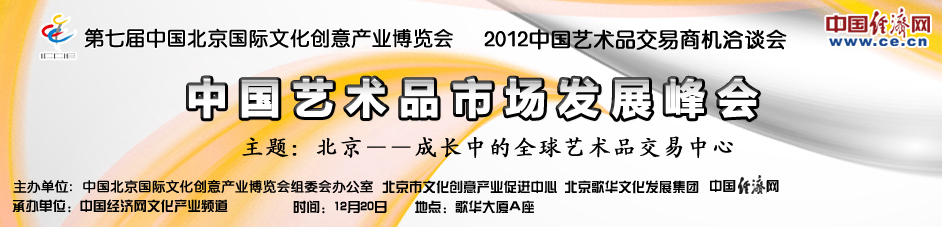 目前,北京藝術(shù)品市場在全球格局中將處于怎樣的定位?藝術(shù)品的稅收問題如何解決?中國藝術(shù)品經(jīng)營及研究機(jī)構(gòu)面臨哪些機(jī)遇和挑戰(zhàn)?文化保稅區(qū)的政策優(yōu)勢如何能促進(jìn)北京藝術(shù)品交易市場的發(fā)展?作為2012第七屆中國北京國際文化創(chuàng)意產(chǎn)業(yè)博覽會(huì)重要的活動(dòng)之一,由北京文化創(chuàng)意產(chǎn)業(yè)促進(jìn)中心、北京歌華文化發(fā)展集團(tuán)和中國經(jīng)濟(jì)網(wǎng)共同主辦,中國經(jīng)濟(jì)網(wǎng)文化產(chǎn)業(yè)頻道承辦的“2012中國藝術(shù)品市場發(fā)展峰會(huì)”將于12月在北京舉行,特邀請政府相關(guān)部門及各方人士針對目前北京藝術(shù)品市場發(fā)展現(xiàn)狀和發(fā)展趨勢進(jìn)行直接的交流對話。
