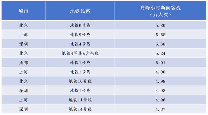 早晚高峰時(shí)期,哪條地鐵線乘客最多?根據(jù)《報(bào)告》,從線路來看,高峰小時(shí)斷面客流最高的10條線路依次是:北京地鐵6號(hào)線5.80萬人次、上海地鐵9號(hào)線5.68萬人次、深圳地鐵4號(hào)線5.38萬人次、北京地鐵4號(hào)線&大興線5.24萬人次、成都地鐵1號(hào)線5.01萬人次、上海地鐵1號(hào)線4.98萬人次、北京地鐵10號(hào)線4.98萬人次、深圳地鐵1號(hào)線4.98萬人次、上海地鐵11號(hào)線4.96萬人次、深圳地鐵14號(hào)線4.87萬人次。