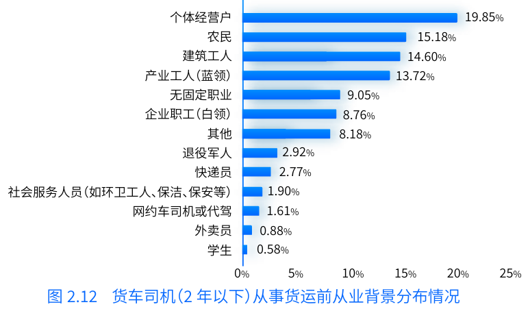 不僅如此,報告中還提到,過往貨運行業(yè)對傳統(tǒng)行業(yè)從業(yè)者的吸引力較強,多為農(nóng)民、個體經(jīng)營戶、產(chǎn)業(yè)工人(藍(lán)領(lǐng))、無固定職業(yè)、建筑工人等群體。而近幾年,轉(zhuǎn)型從事貨車司機(jī)的職業(yè)還包含了企業(yè)職工(白領(lǐng))、社會服務(wù)人員、學(xué)生等,另外,外賣員、快遞員、網(wǎng)約車司機(jī)及代駕司機(jī)等新型靈活就業(yè)者也有部分人群選擇轉(zhuǎn)行成為貨車司機(jī)。