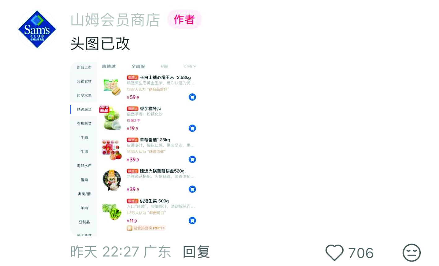 “本次APP的改動于今年8月底開始上線進(jìn)行測試,并在期間持續(xù)根據(jù)會員的反饋進(jìn)行優(yōu)化。這兩天我們陸續(xù)收到了更多來自會員關(guān)于商品圖片等方面的寶貴建議,我們將會持續(xù)改進(jìn),以更好地展現(xiàn)商品的真實(shí)形態(tài)并提升體驗(yàn)。我們始終珍視會員的聲音,歡迎大家在‘山姆APP—我的—用戶調(diào)研—商品詳情頁調(diào)研’持續(xù)給予反饋。感謝大家的支持。”除此之外,山姆還在評論區(qū)配圖稱:“頭圖已改?!?/p>