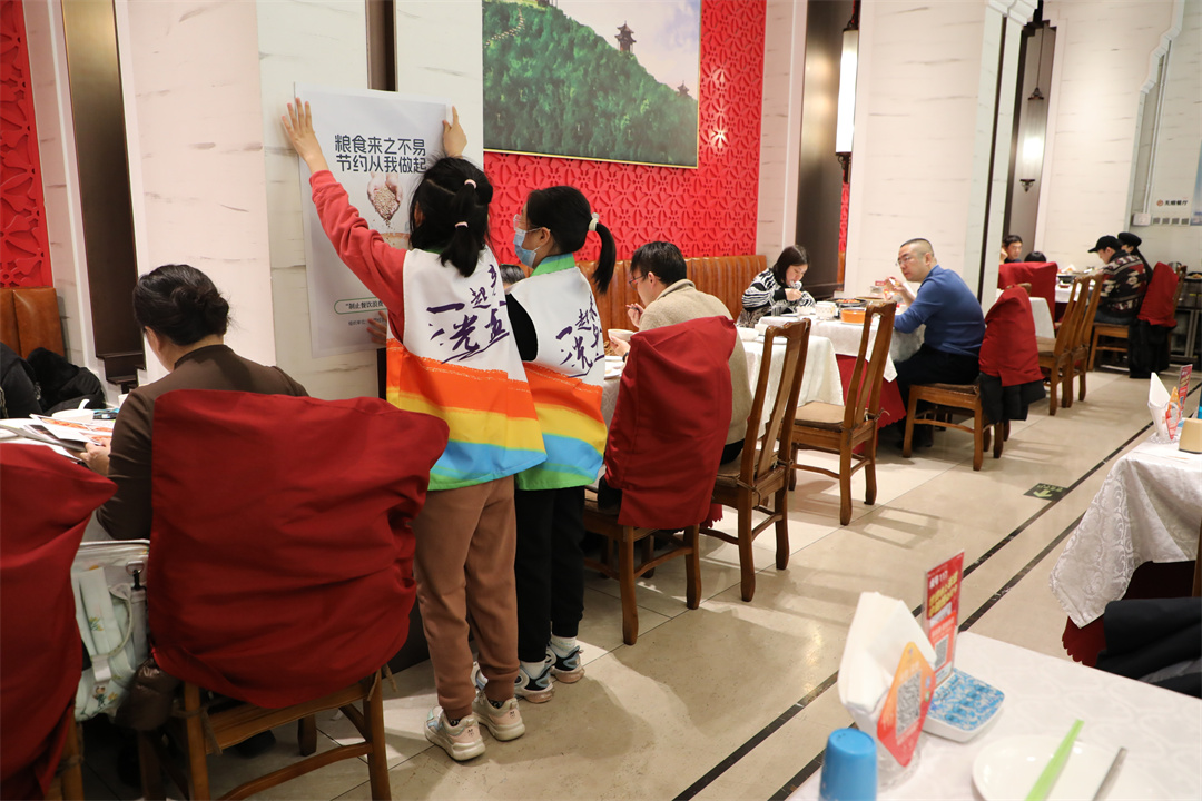 志愿者們還學(xué)以致用,化身“制止餐飲浪費(fèi)宣傳員”,向餐廳中的食客宣傳節(jié)糧反浪費(fèi)知識(shí),發(fā)放節(jié)糧知識(shí)宣傳單,并邀請(qǐng)食客寫下自己節(jié)約糧食和避免浪費(fèi)的心得。在店食客積極參與留言并對(duì)小志愿者的宣講表示認(rèn)同。