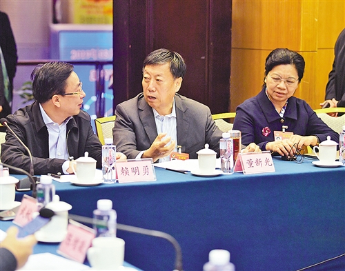 左圖 3月10日,全國(guó)政協(xié)民建界別在駐地舉行小組會(huì)議。會(huì)前,全國(guó)政協(xié)委員蒙曉靈、董新光、賴(lài)明勇(從右至左)就“如何探索生態(tài)優(yōu)先、綠色發(fā)展為導(dǎo)向的新路子”展開(kāi)交流。 本報(bào)記者 高興貴攝