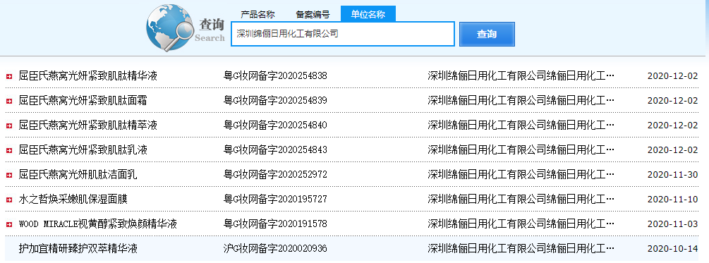記者通過國產非特殊用途化妝品備案平臺查詢得知,深圳綿儷日用化工有限公司是屈臣氏燕窩光妍緊致肌肽精華液、歐薇蔻肌肽水光晶致面膜、護加宜精研臻護雙萃精華液等800多款產品的生產企業(yè)。