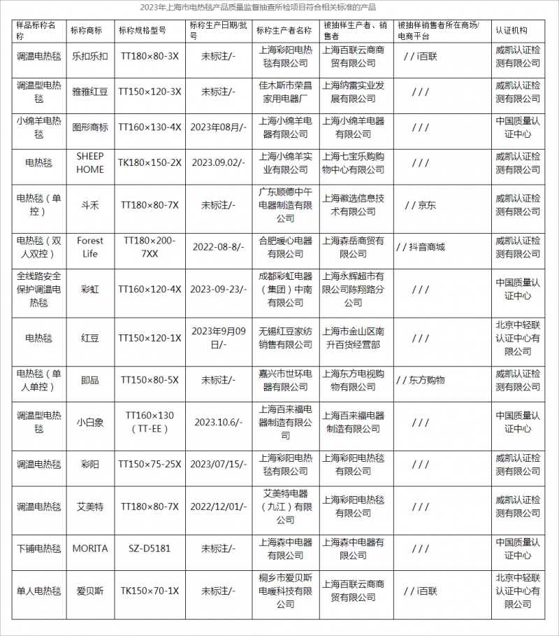 本次監(jiān)督抽查依據(jù)為SHSSXZ0065-2023《電熱毯上海市產(chǎn)品質(zhì)量監(jiān)督抽查實施細則》組織實施。