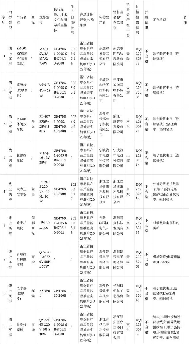 本次抽查了43批次按摩器具產(chǎn)品,其中9批次產(chǎn)品不合格。不合格項(xiàng)目為對觸及帶電部件的防護(hù)、機(jī)械強(qiáng)度、結(jié)構(gòu)、電源連接和外部軟線、外部導(dǎo)線用接線端子、端子騷擾電壓(連續(xù)騷擾)、騷擾功率、輻射騷擾。