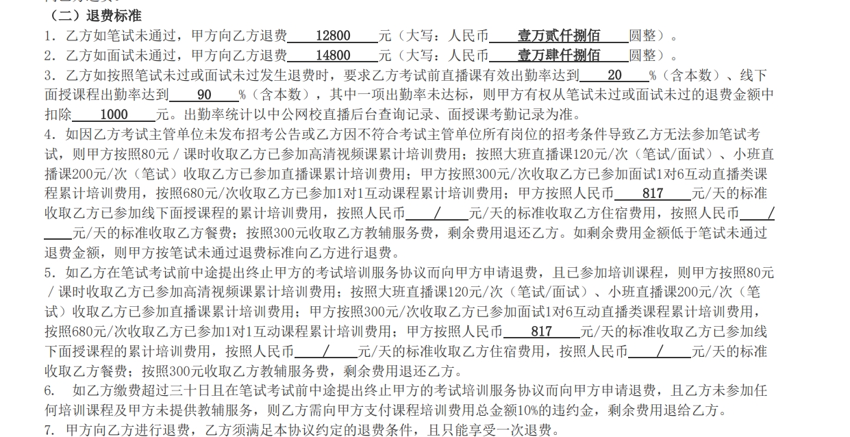 記者在武女士提供的其與中公教育簽訂的協(xié)議書里看到,符合出勤率等其他條件后,如果筆試或面試未通過,中公教育將為學(xué)員全額退款。學(xué)員需在規(guī)定時間內(nèi)提交相關(guān)材料申請退費,中公教育核實所提交材料真實、符合退費條件后,在30至45個工作日內(nèi)將約定的退費金額支付至學(xué)員提供的銀行賬戶。