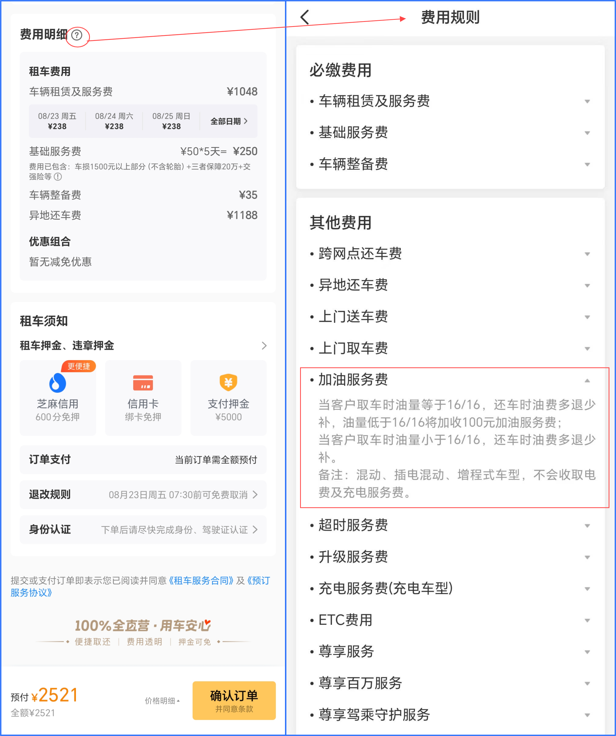 《中國消費者報》在神州租車APP上下單租車,經(jīng)過仔細找尋,發(fā)現(xiàn)必須點開“費用明細”旁邊一個不起眼的圓圈小問號圖標后,才會跳轉(zhuǎn)至標注著“費用規(guī)則”的清單。在“其他費用”一欄中包括了“加油服務費”,點開后灰色小字顯示“當客戶取車時油量等于16/16,還車時油費多退少補,油量低于16/16將加收100元加油服務費”。