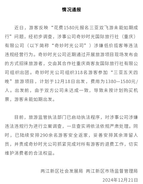 據(jù)通報(bào),經(jīng)初步調(diào)查,涉事公司奇妙時(shí)光國(guó)際旅行社(重慶)有限公司(以下簡(jiǎn)稱(chēng)“奇妙時(shí)光公司”)涉嫌低價(jià)攬客等違法違規(guī)經(jīng)營(yíng)行為。奇妙時(shí)光公司近期通過(guò)開(kāi)展旅游項(xiàng)目現(xiàn)場(chǎng)發(fā)布會(huì)的方式招徠旅游者,交由其合作方重慶商客友國(guó)際旅行社有限公司組織出團(tuán)。奇妙時(shí)光公司組織318名游客參加“三亞五天四晚”旅游項(xiàng)目,計(jì)劃于12月18日出發(fā),費(fèi)用為每人1380至1580元。出發(fā)前,由于雙方公司未達(dá)成一致,導(dǎo)致未按計(jì)劃購(gòu)買(mǎi)機(jī)票,游客未能如期出發(fā)。