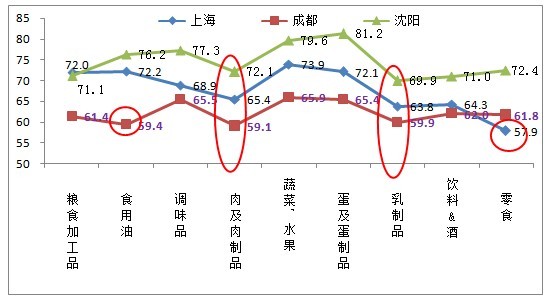針對食品安全現(xiàn)狀信心指數(shù)較低的三個(gè)城市:上海、成都、沈陽。沈陽表現(xiàn)相對較好,信心指數(shù)較高;其次是上海;最低的是成都。其中肉及肉制品和乳制品在三大城市中的安全信心指數(shù)都相對偏低,直接影響了三大城市的綜合信心程度。此外,食用油在成都的安全信心指數(shù)、零食在上海的安全信心指數(shù)也有待提高。