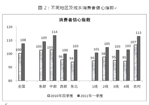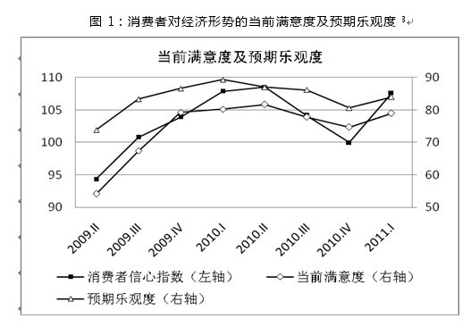 2011年一季度中國(guó)消費(fèi)者信心指數(shù)為108,比2010年四季度大幅上升8點(diǎn),接近近兩年高點(diǎn)。消費(fèi)者對(duì)當(dāng)前經(jīng)濟(jì)形勢(shì)的滿意度和對(duì)未來(lái)經(jīng)濟(jì)走勢(shì)的預(yù)期樂(lè)觀度均明顯上升,持樂(lè)觀態(tài)度的消費(fèi)者比重均接近兩年內(nèi)的最高點(diǎn)。