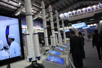 即將于2014年實現(xiàn)首飛的新一代大運載火箭“長征五號”模型高高地矗立著。“長二F”、“長三甲”、“長四乙”等白色箭體模型緊隨其后,一字排開,場面蔚為壯觀。很多電視媒體在采訪時,都有意識地將長征火箭或者“天宮一號”的模型作為背景。