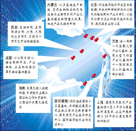 上海國(guó)家民用航天產(chǎn)業(yè)基地核心區(qū)1平方公里基本布局完畢,并正在開展新增3.93平方公里發(fā)展用地的概念性規(guī)劃和控制性詳細(xì)規(guī)劃。西安國(guó)家民用航天產(chǎn)業(yè)基地包括四院、五院西安分院、六院、九院的眾多項(xiàng)目,目前多個(gè)項(xiàng)目已開始陸續(xù)進(jìn)駐。在四川成都,以七院為核心,結(jié)合西部開發(fā)、產(chǎn)業(yè)轉(zhuǎn)移,正在積極謀劃軍民結(jié)合基地建設(shè)。在中國(guó)北疆的內(nèi)蒙古,集團(tuán)公司以多晶硅生產(chǎn)制造、空間生物制品和風(fēng)電設(shè)備為主要項(xiàng)目的產(chǎn)業(yè)化基地建設(shè)取得重大成果,相關(guān)產(chǎn)品已推向市場(chǎng),取得了較好的經(jīng)濟(jì)效益。