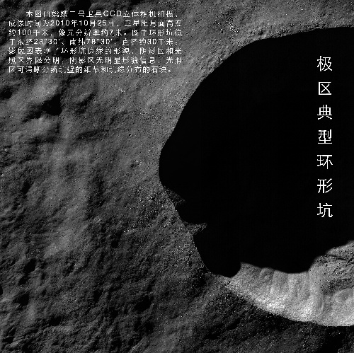 北京,2010年11月8日 國(guó)家國(guó)防科技工業(yè)局首次發(fā)布嫦娥二號(hào)月面虹灣局部影像圖 這是極區(qū)典型環(huán)形坑(成像時(shí)間為10月25日)。